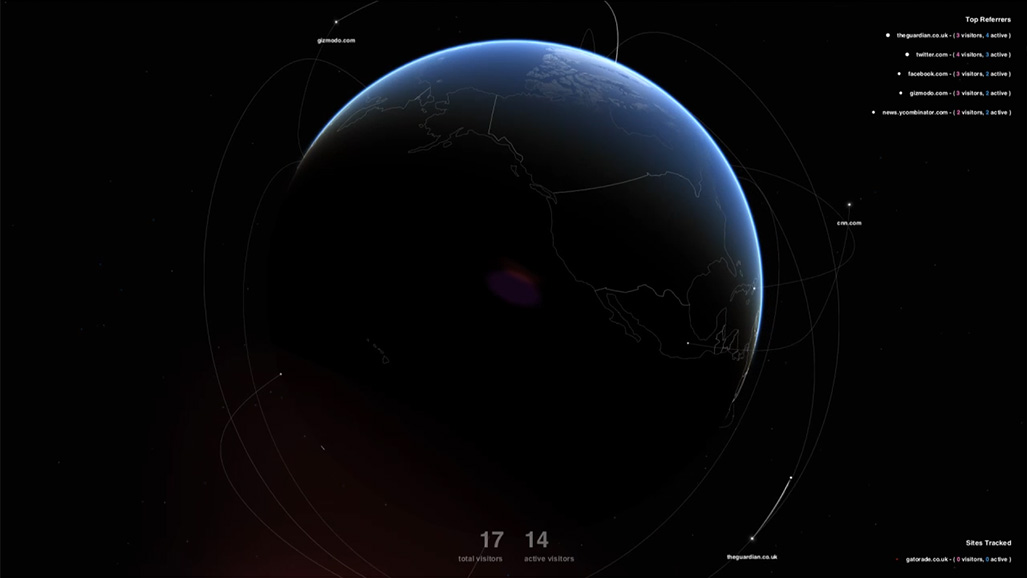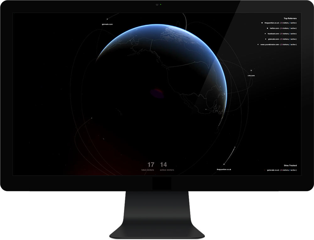 Atlas is a visualization application that monitors your visitors interactions in real-time. Web statistics can be a very abstract concept, a number and a graph that may not always connect to what it means to have thousands of people interacting with your campaign or site. Atlas is an attempt to make stats into something you can feel.