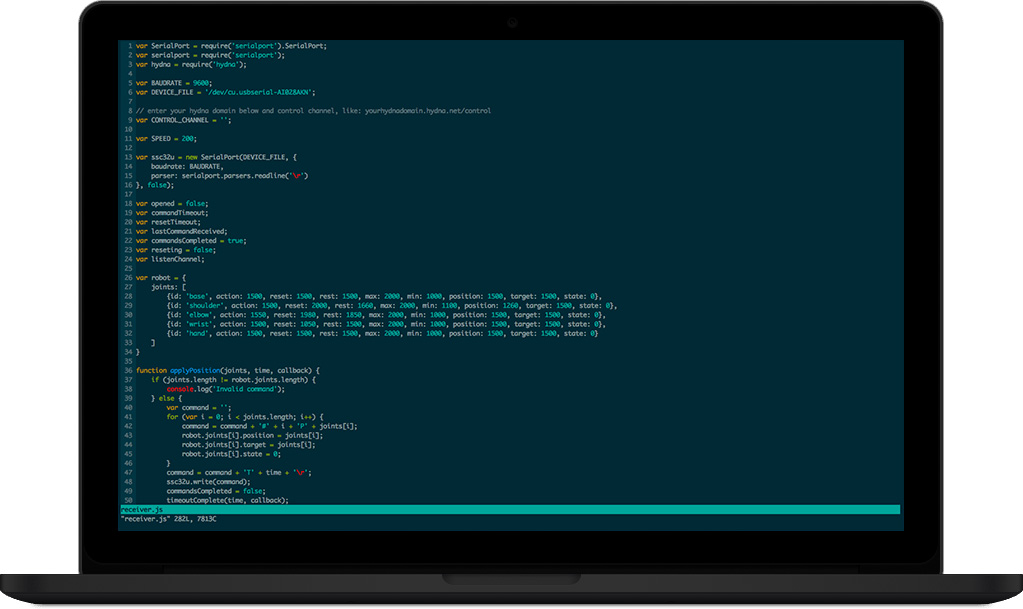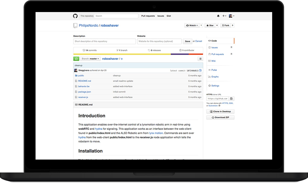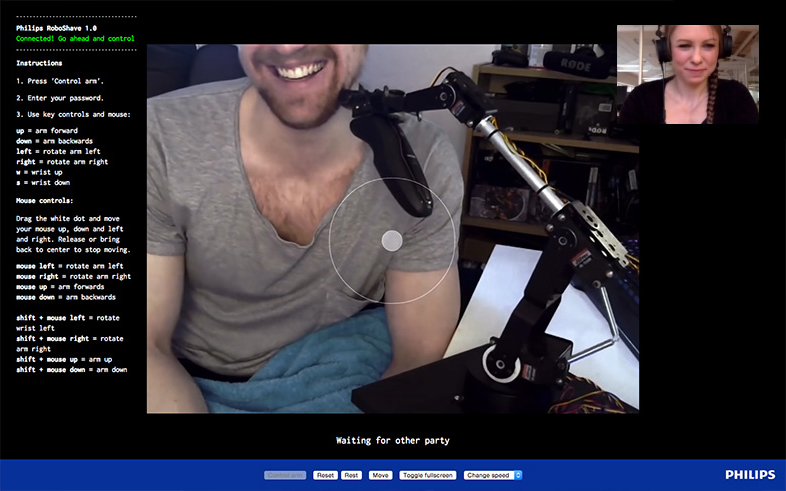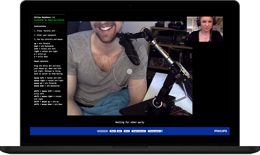 The Roboshaver is built using the AL5D robotic arm from lynxmotion and some custom developed software to control the arm over the internet. We chose to build the control layer on node.js and to run the video feed over WebRTC using hydna for signaling and message passing and if you want to do the same you are welcome to use our code on GitHub.