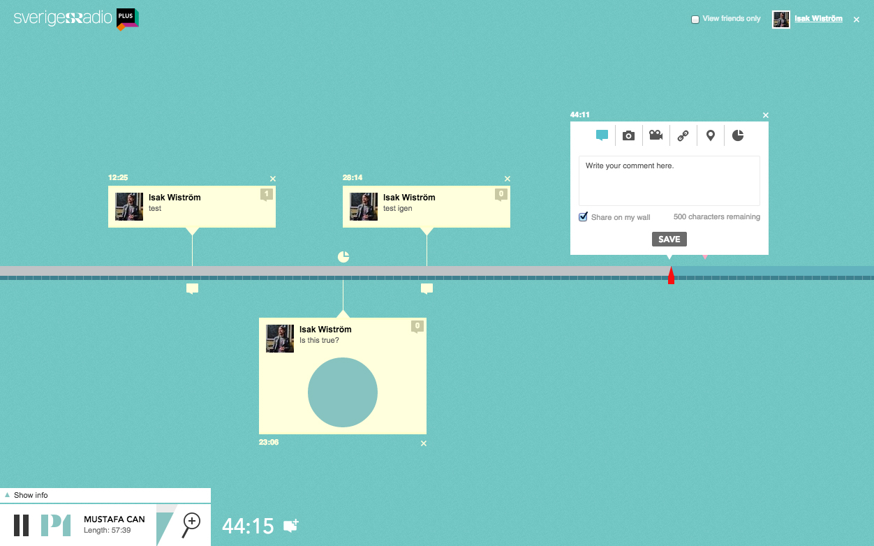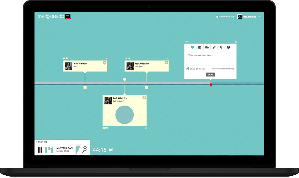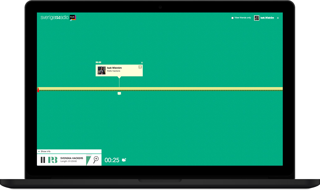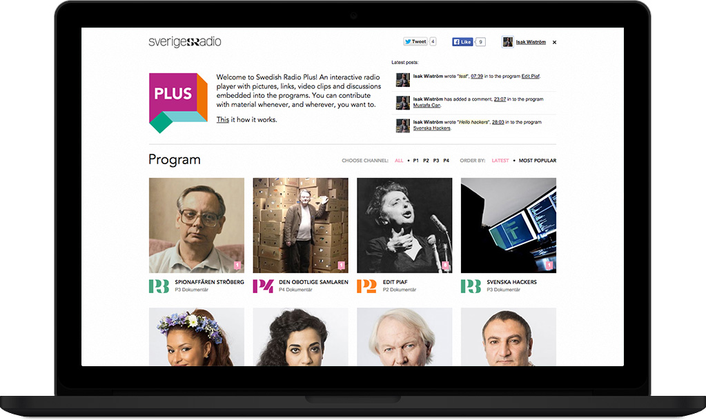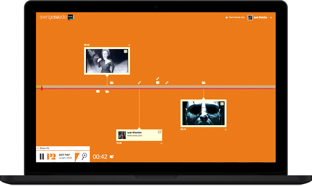 A new way of seeing radio. For Swedish Public Radio and Forsman & Bodenfors skäggivara helped create a new kind of radio experience. Listeners could interact with a selected set of radio shows on top of a timeline. Links, comments and polls could be added to the timeline and commented on, links where processed and a short link description with images where shown with the links. Using hydna material added was shown in real-time to other viewers as they were added.